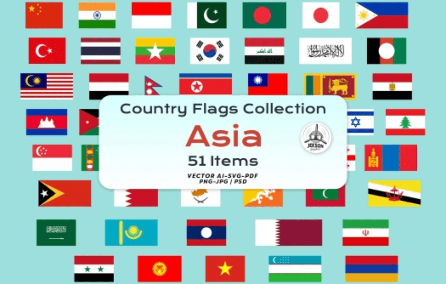 the vibrant and diverse Asia Flag Icons Collection by JeksonGraphics. This premium set includes 51 original flags representing countries across Asia, all beautifully crafted in vector and Photoshop formats for easy customization. Each flag is designed with authenticity in mind, ensuring accurate colors, dimensions, and closed paths for a high-quality finish.