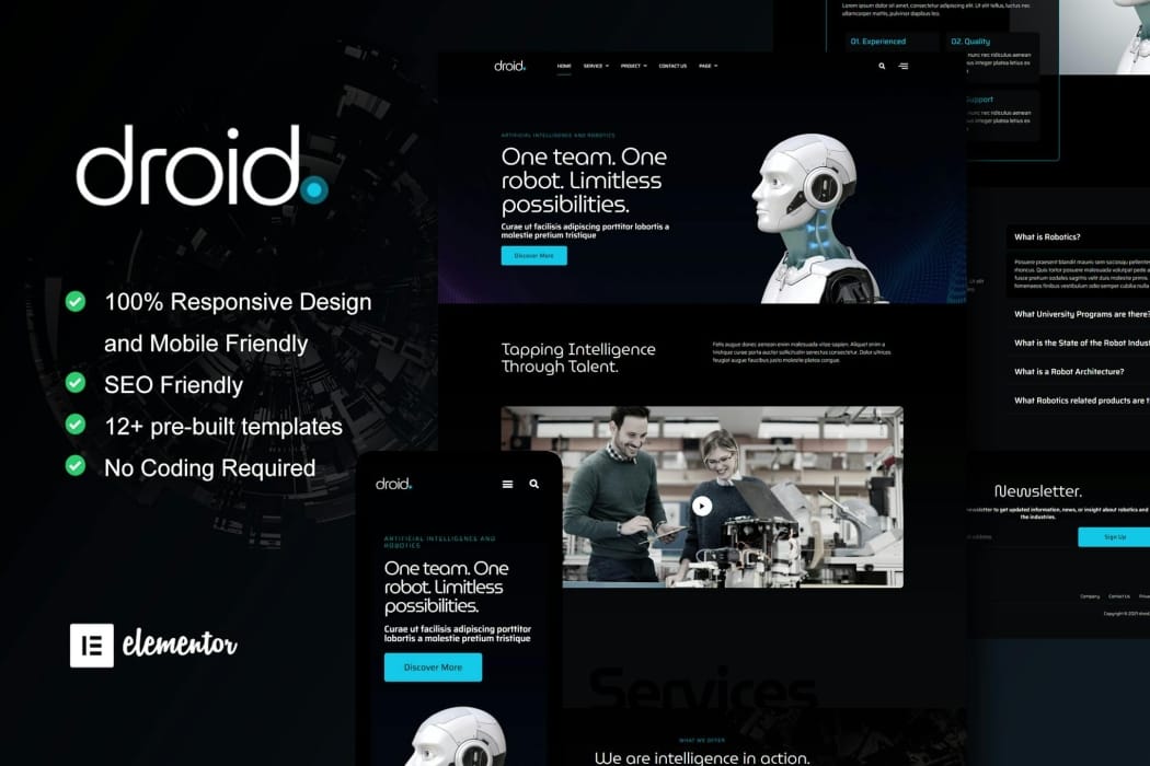 Meet Droid, the ultimate Elementor Template Kit for Robotics & Technology Services. This user-friendly and fully customizable kit is designed to showcase your innovative tech solutions effortlessly. With sleek layouts, responsive design, and a variety of pre-built sections, you can effortlessly create a professional website that stands out. Perfect for tech companies, startups, and innovators.
