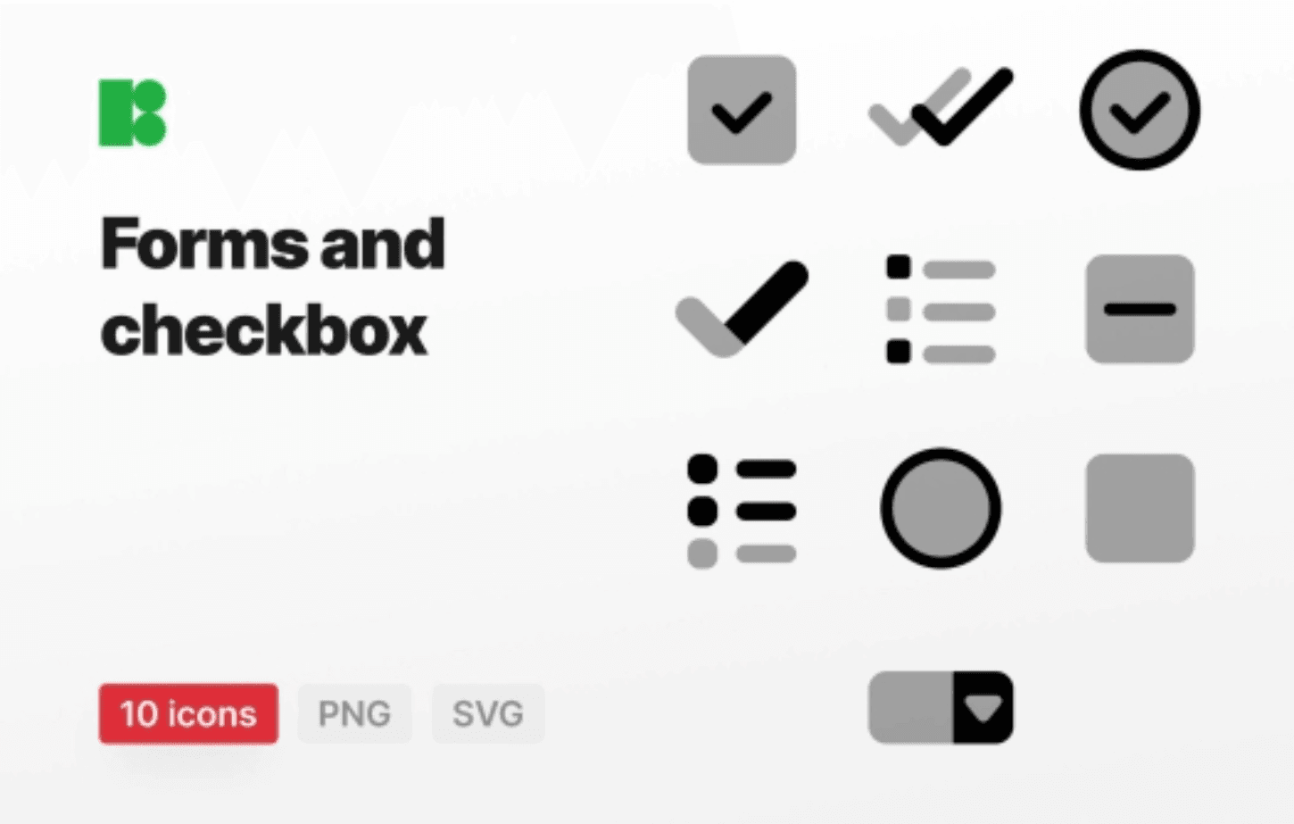a collection of sleek and modern icons perfect for any project requiring forms and checkbox designs. This set features a variety of meticulously crafted icons in Vector SVG format and transparent PNGs. Included in this bundle are designs such as Dropdown Field, Unchecked Radio-button, Checked Radio-button, Checkmark, Indeterminate Checkbox, Multiple Choice, Double Tick, Unchecked Checkbox, Checklist, and Checked Checkbox.