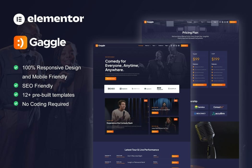 Features of Gaggle – Comedian & Entertainment Show Elementor Pro Template Kit