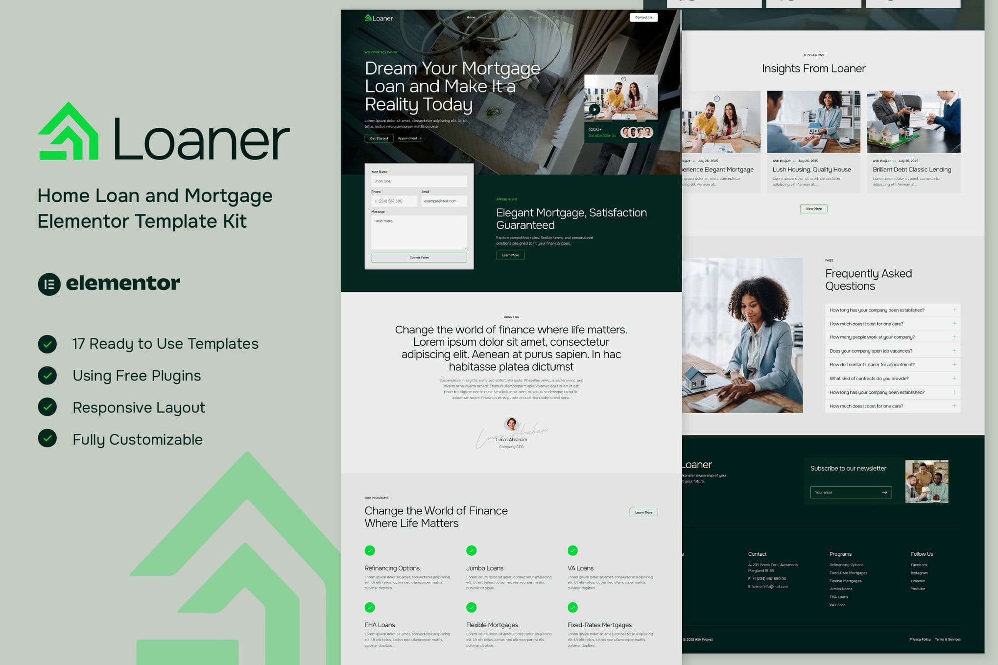 Introducing Loaner, the ultimate Elementor Template Kit for home loans and mortgages. With its modern design and user-friendly layout, this kit makes it easy to create a stunning website that connects clients with the mortgage solutions they need. Customize effortlessly to showcase your services, attract leads, and streamline your online presence in the finance industry. Perfect for lenders, brokers, and real estate professionals!