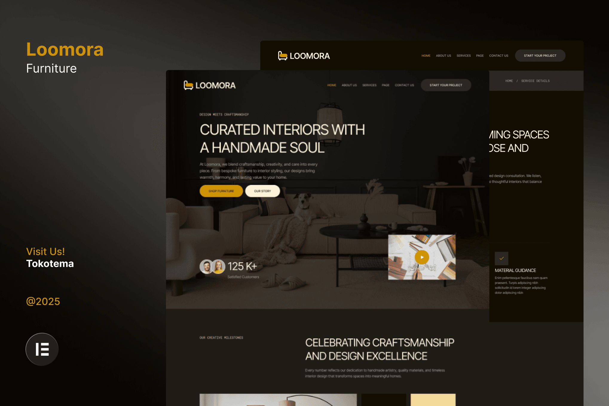 Features of Loomora – Dark Handmade Furniture & Interior Design Website Elementor Template Kit