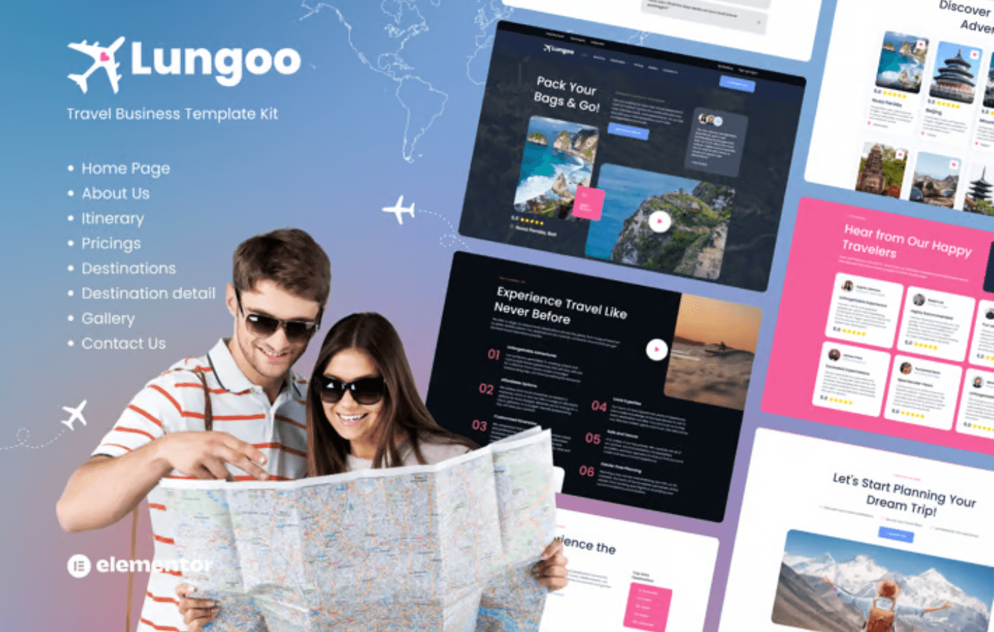 Lungoo is a clean and modern Elementor template kit designed for travel businesses. This easy-to-use kit features beautifully crafted templates for showcasing travel packages, destinations, and services. With its responsive design and customization options, Lungoo makes it simple to create a professional and attractive website that captivates and converts visitors into loyal customers. Perfect for travel agencies looking to make a lasting impression online!